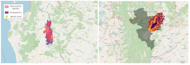 Figure 1. Comparison between observed and simulated extreme fire events in 2020 (Left) and 2017 (Right) respectively